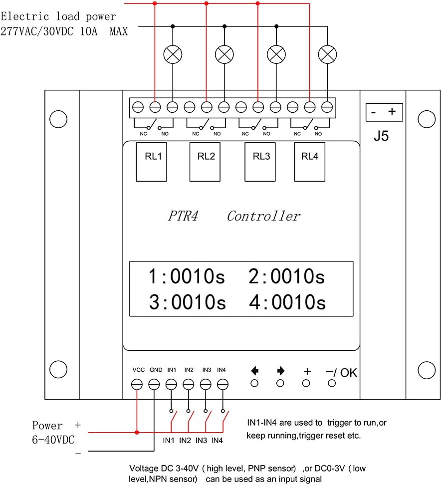 This controller is a 4-channel time relay; each channel of relay can run independently and it also can run in turn. It can be controlled by detecting four channels of input vole signal to control four loads on/off independently or in turn, such as controlling four solenoid valves to work independently or work in turn, controlling four input signal to delay on/off, etc. Specifications: Timing : 0.1s - 9999min Adjustable Cycle: 0 - 9999 times Adjustable Working Power ply: DC6-40V Four Signal Input Impedance > 100K Input Signal Vole : DC0-40V Working Current: When back off current is about 9mA/12V(0.11W) 4 Relays Working Current: about 170mA/12V(2W) Four Set of Conversion(normally open and normally closed) Contact Load: 10A/277V AC or 10A/30V DC Contact Resistance: <=100mΩ (1A 6V DC) al Durability: 10 million Electricity Durability: >100,000 (10A-250V AC) Operating Temperature: -40~85°C Item Size: 11 * 8.5 * 3.7cm / 4.33 * 3.35 * 1.45in Item Weight: 196g / 6.92oz Package Size: 15 * 9.5 * 5cm / 5.91 * 3.74 * 1.97in Package Weight: 248g / 8.76oz Package List: 1 * Relay Module